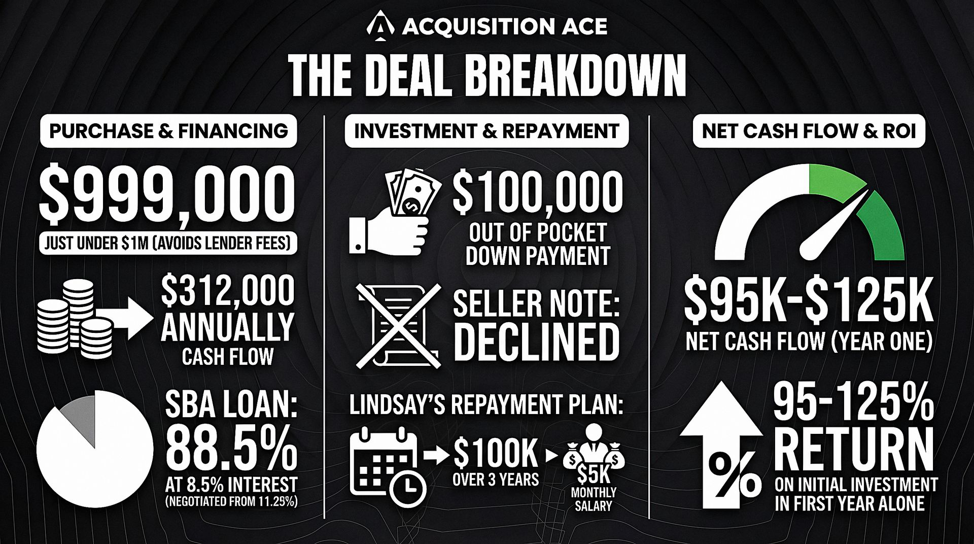 Down payment: $100,000 out of pocket Seller note: Attempted but seller declined